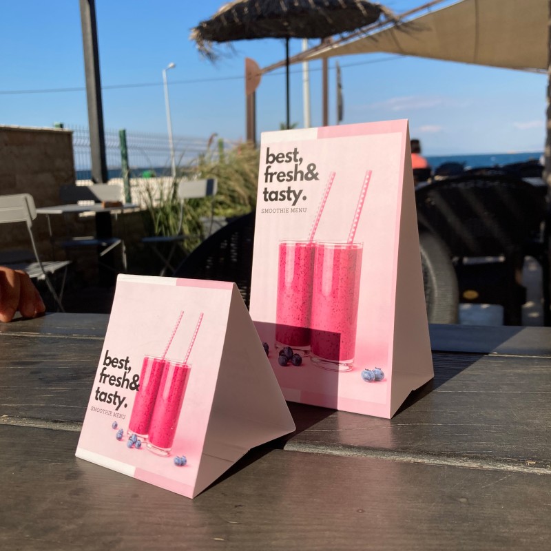 Masa kartı, işletmenizin kampanya, özel ürün veya duyurularını etkili bir şekilde müşterilere sunmak için ideal bir tanıtım aracıdır. Üçgen şekilde katlanan tasarımı sayesinde masalarda kolayca dikkat çeker ve kafe, restoran, otel gibi işletmelerde sıklıkla tercih edilir.
