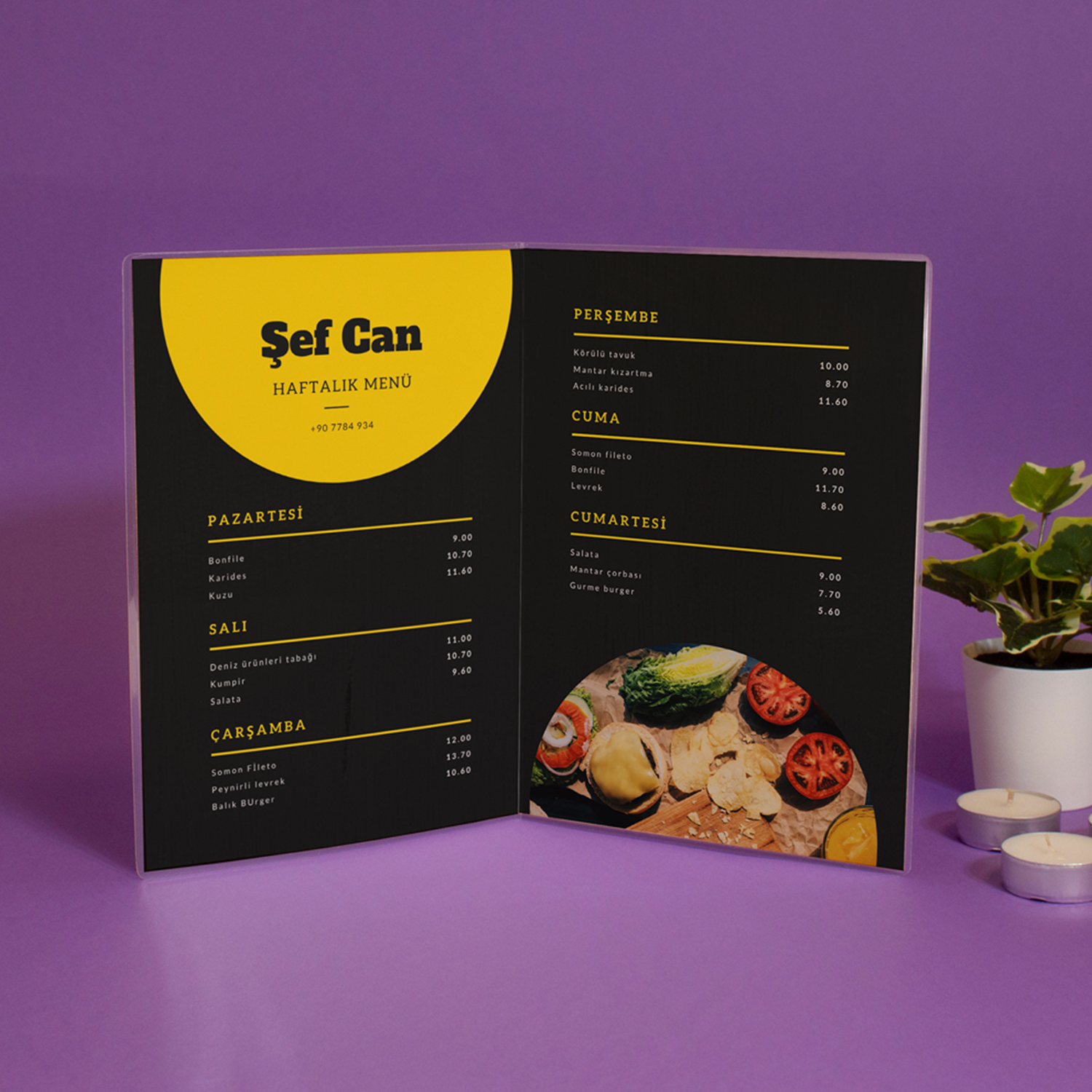 PVC menüler, suya dayanıklı yapısı, kolay temizlenebilir yüzeyi ve estetik görünümü ile işletmenizin profesyonel imajını güçlendirir. Özellikle yoğun kullanıma uygunluğu sayesinde uzun vadeli bir yatırım sunar.